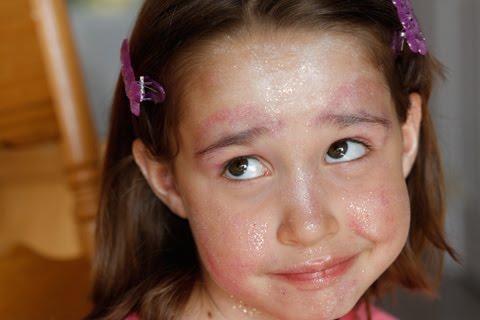 Grandma has the coolest "beauty kit" for kids, full of bright, colorful goodies (or goop) that can be spread all over kids' faces. My second oldest daughter took the role of makeup artist for her younger sisters; these photos show her "masterpieces."